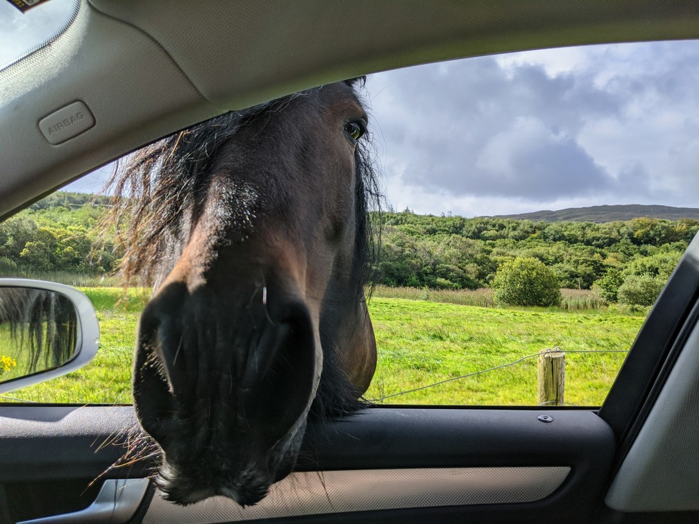 After breakfast, we drove out to the Puxley Castle to explore the area, as we were not leaving on the car ferry until 11:30 am. On the drive out to Puxley, we stopped the car to look at some nice hairy horses. One horse got a little too curious and decided he wanted to look inside the car and to try to lick the driver of the car :). The kids loved this, so did mammy.