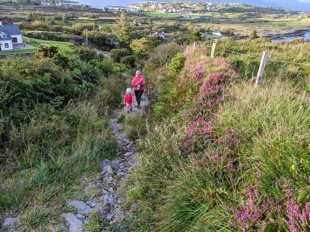 We walked on the road from the pier up the hill until we met the crossroads. The crossroads seems to be a starting point with an information sign and a 2km signpost. We continue up the hill for 20m and see another sign pointing into someone’s garden (Edel told us about this and the person allows access). Even though we knew the owner allows walks to walk past their front door we couldn’t help but to tiptoe and sneak past hoping not to disturb anyone.
