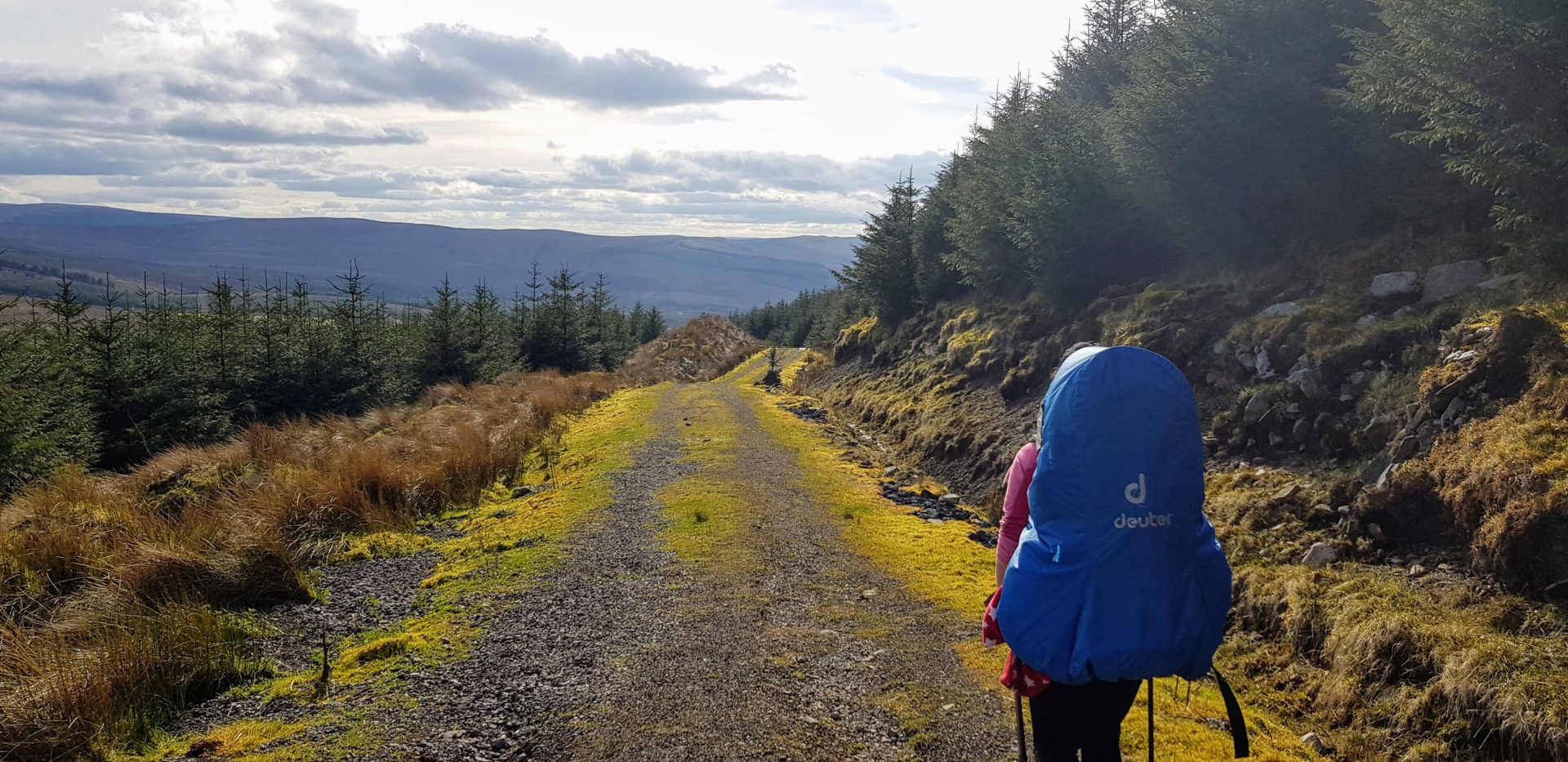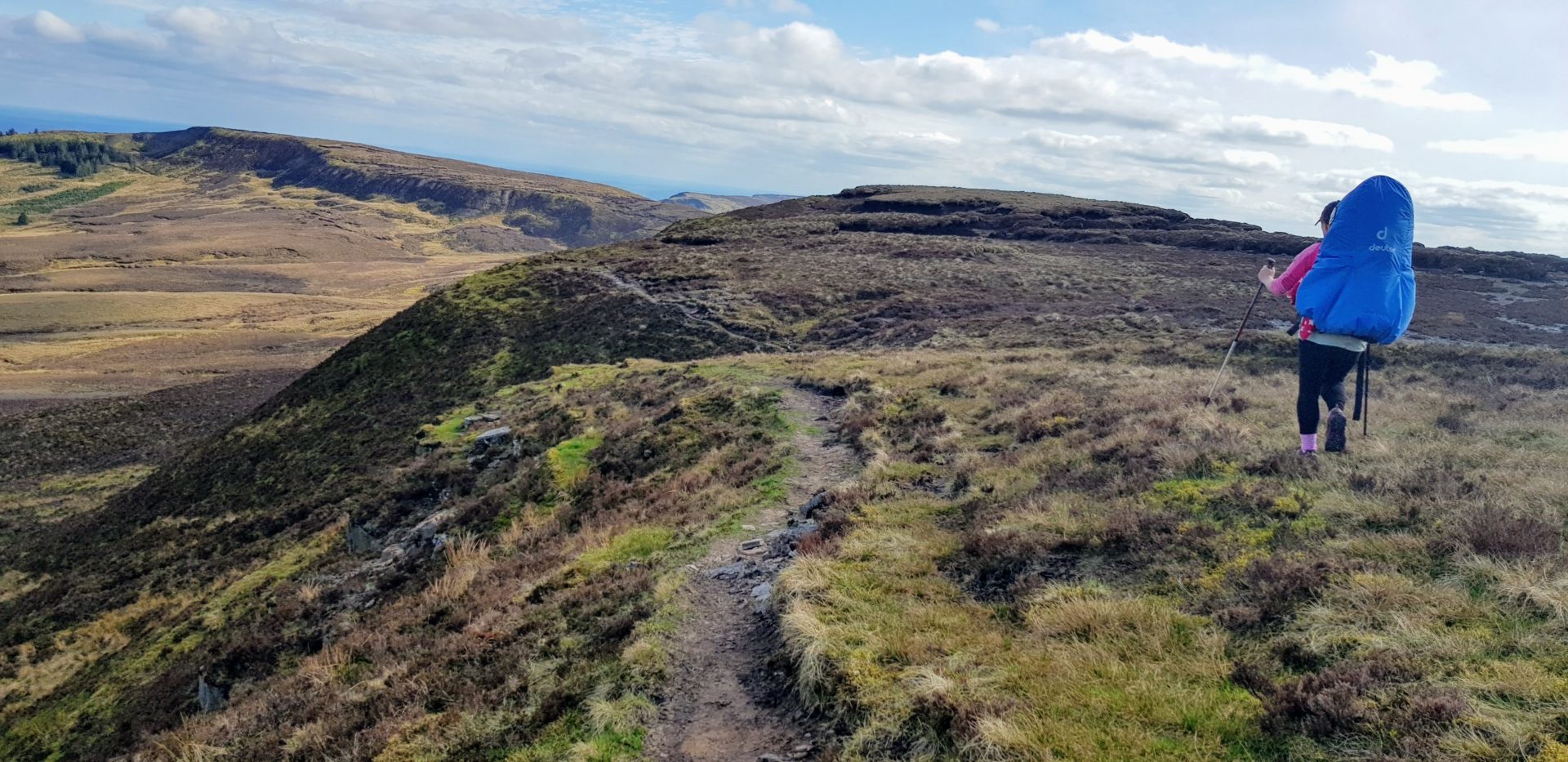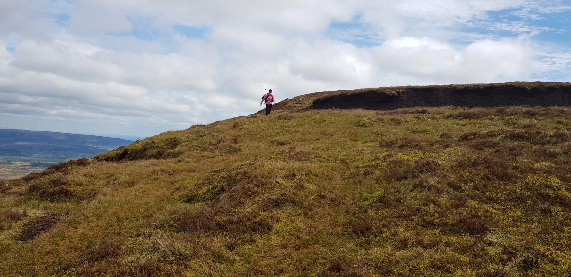 We eventually reached the end of the wood road which zigzagged up to the TV mast, just below the top of a steep hill. From here, we had to follow a wire fence up the hill to reach the top. When we reached the top, we could see the summit of Cuilcagh Cavan and Fermanagh high point. According to the OS map, we only had over 100 vertical meters left to the summit but we had to walk 3-4 km to reach it. There is a trail along this mountain but it cuts very close to the cliff edges, we chose to stay inland a bit more because Ourlittlehikers bag acts like a sail sometimes and we were afraid that it could be caught with a random wind gust.