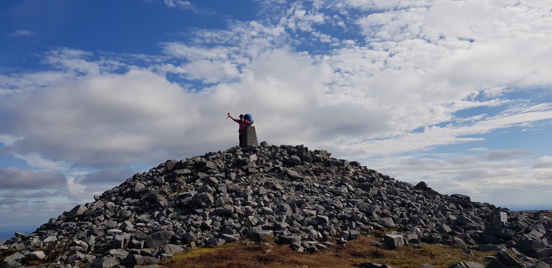 From this side of Cuilcagh, the mountain is shaped like a semi-circle or horseshoe and we were walking around the top edge to reach the summit. Just as we reached the last section we had to climb a steep slope to reach the top section, this is where the Cairn rests. When we reached the top of the steep slope, we could eventually see the Cairn. We walked over to the Cairn, which rests on a large pile of stones on the opposite side of the Cuilcagh Cavan mountain top.