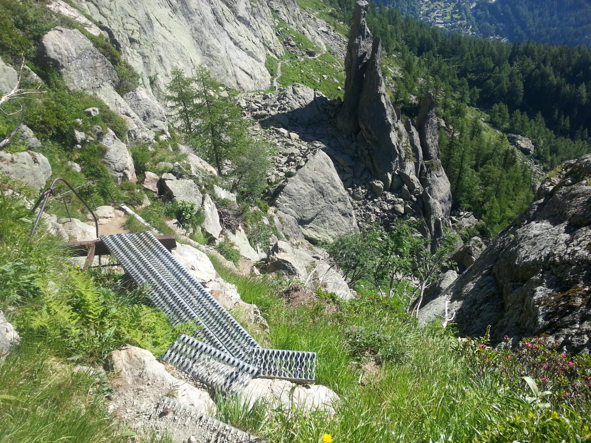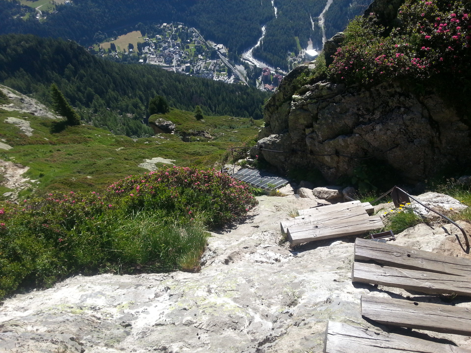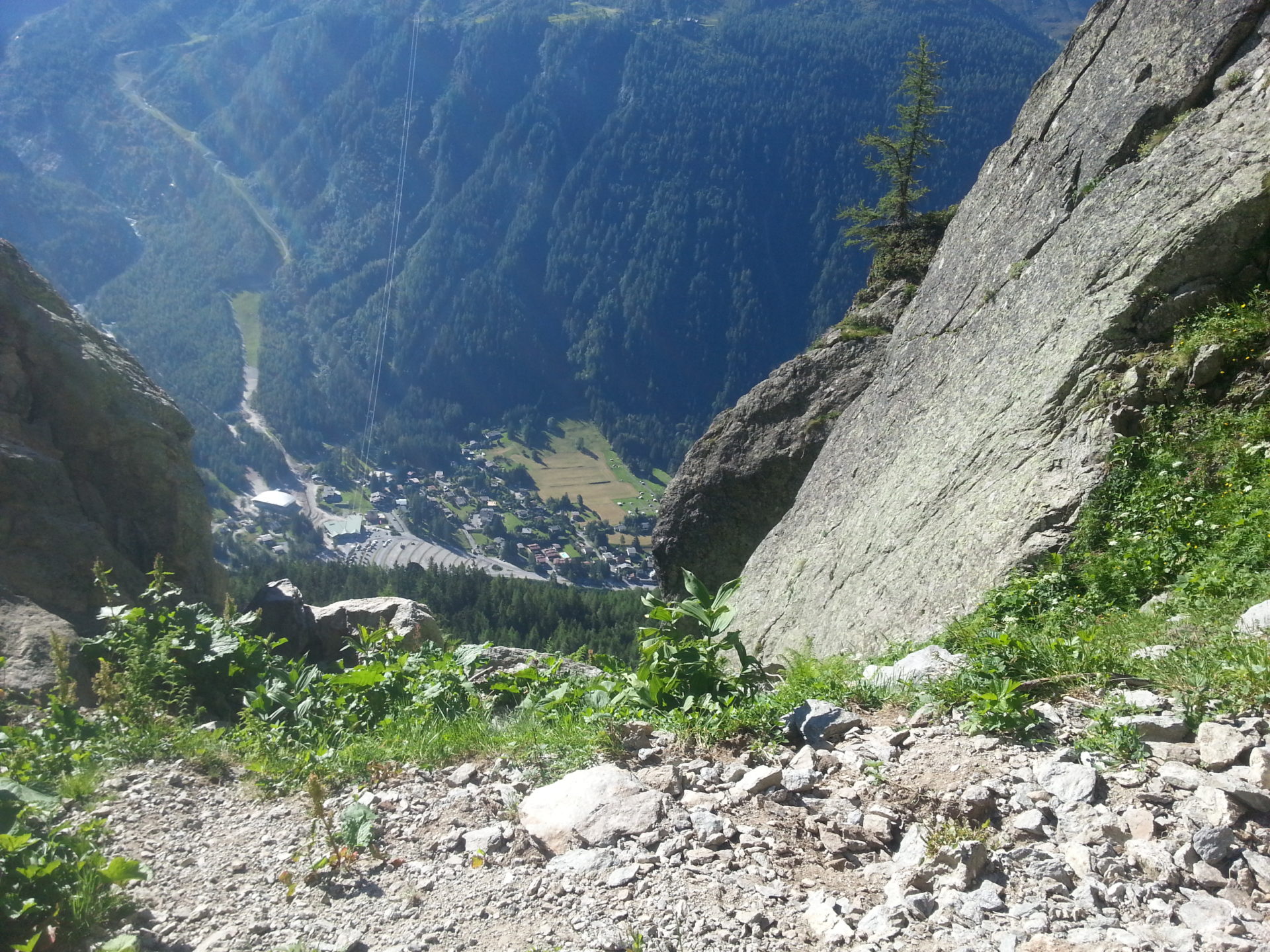 After reaching Col Cornu we could see straight down the other side of the valley we could even see the cable car station at Plan Praz, we hoped to reach before 5 pm as they close it then. We left Col Cornu walking downhill at 15:20 the trail was very wide with good firm ground conditions, it zig-zagged down very steeply.