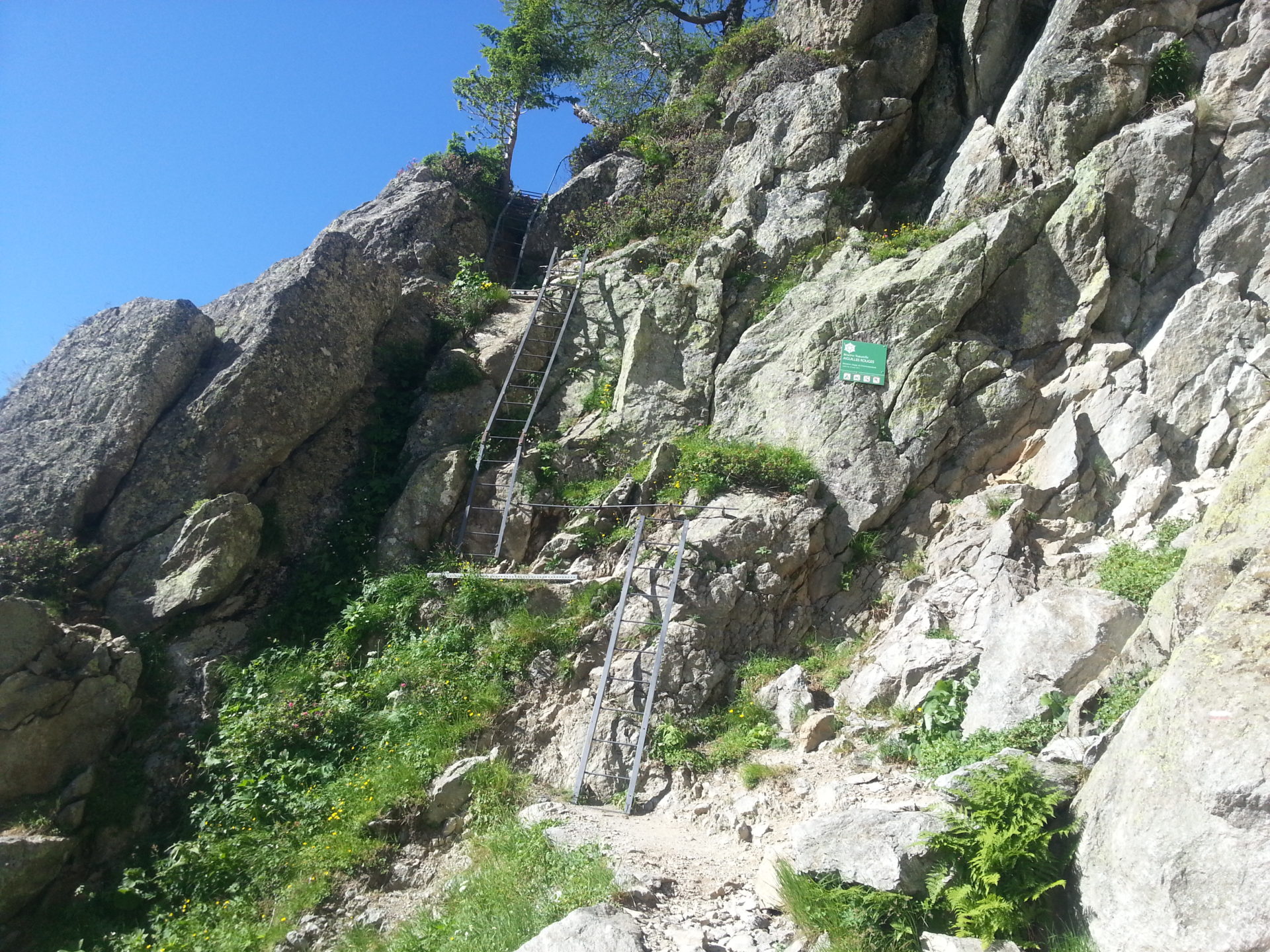 It took us 1 hour 20 minutes to reach the rocky base of Aiguillette d’Argentiere at 1893m from Tré le Champ. From here we get our first sight of the ladders used to climb the rock edges. Understandably Georgina is not used to climbing ladders or rock climbing and she was very nervous about the ladders. To make her even more nervous we met 2 older female walkers walking backwards from the ladders due to their fear of climbing them. They turned around to take the lower route to bypass the ladders and were very upset by it all.