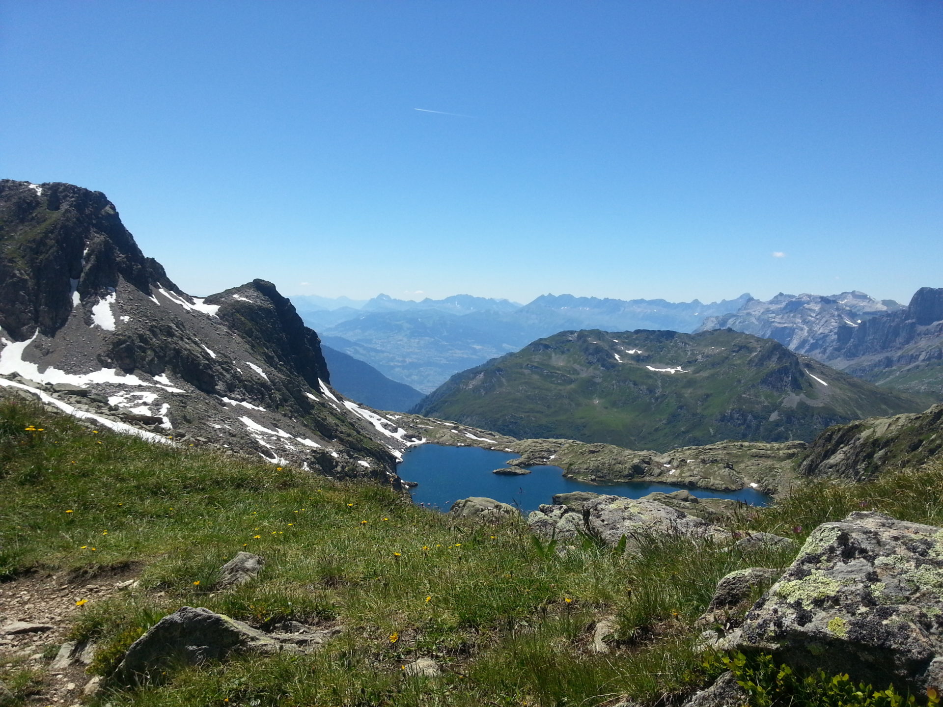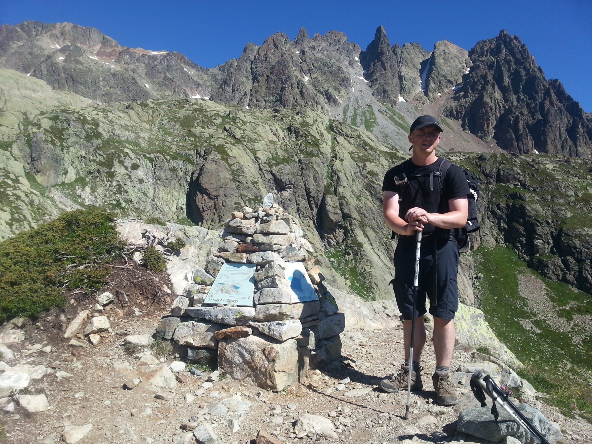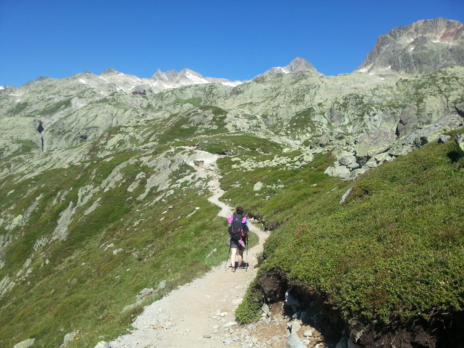 We reached the top of Col de la Gliere at 2461m in 2 hours 30 minutes from Lac Blanc, we then walked between two cols cresting over the ridge of the mountains to Col Cornu at 2406m, this took us 30 minutes. This section of the trail is simply stunning but it was extremely hot when we were here and there was no shelter from the sun.