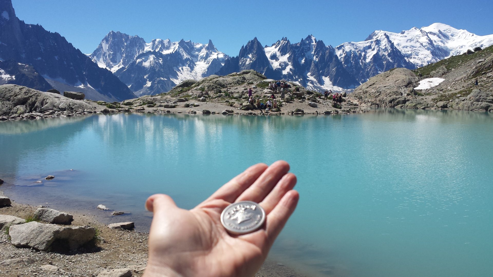 While waiting for our brunch to be cooked we went walking around Lac Blanc and in our opinion, this had the best views of the whole of the Tour du Mont Blanc hike. The coin in Georgina’s hand is our wedding coin as this is our pre-honeymoon holiday, Georgians goal was to try to take a picture of the wedding coin in all our major sights over the next 30 days hiking.