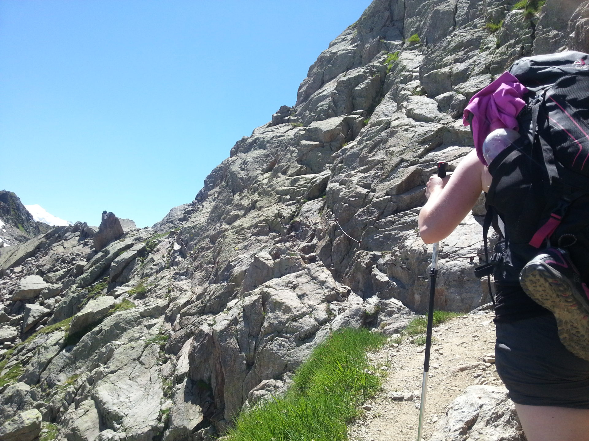 We then descended down into the edge of a valley below but we then rapidly started climbing up the edge of the mountain toward Col de la Gliere at 2461m. On the way to the top of the col we had to use wire ropes and ladders again but at this stage of the day, Georgina was taking it all in her stride and all the nerves had disappeared.