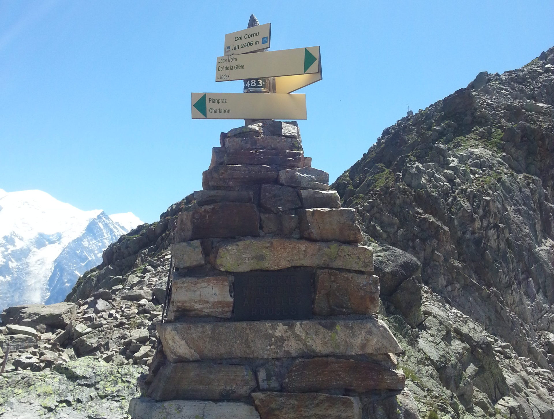 The ladders, railings, chains and steps continued the whole way to Lac Blanc but became less frequent after the below signpost for Lac Blanc. In the below picture you can see the path in the distance that we just walk to get to this point.