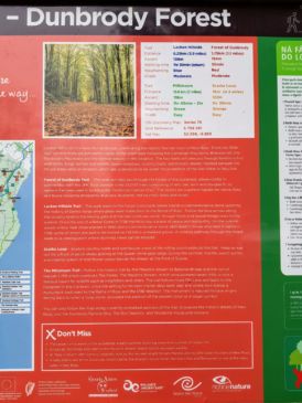 We parked our car at the gates of the forest which probably has room for about 8 cars. There is a large timber sign at the start of the wood saying “forest of the Dunbrody”. We looked at the information board and decided to do the small loop walk around the wood and then walk up toward the 1798 monument.
