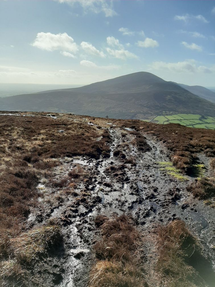 After the forest, the stone walls disappear but the trail is still very prominent. We continue to follow the trail and now we can see mount Leinster in front of us.