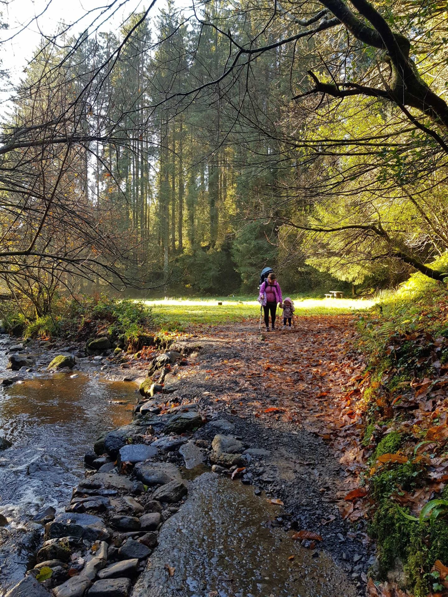 Monicknew Forest Hike started off a very nice walk because it cut through a nice forest footpath for a short period but it quickly turned into walking up a forest lorry road. At the top of the hike, there is a very pretty little area that is very scenic and provides lovely views of the Slieve blooms overhead and the valley below. The deforestation really put a downer on this walk for us but the Yellow loop is an amazing little family hike and ideal for kids. Ourlittlehiker was amazed by the river noise beside her little toddler feet and the sounds made by the cars passing overhead as we walked underneath the large arched bridge.