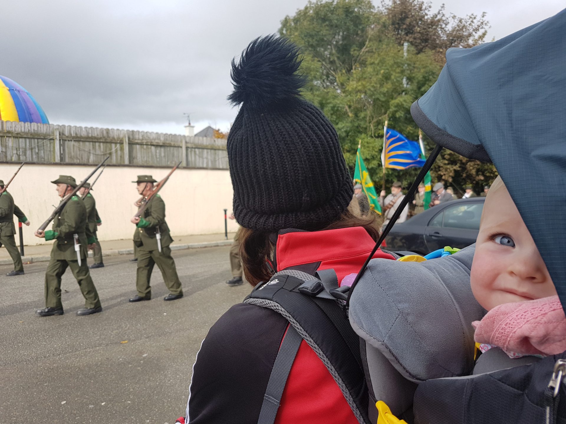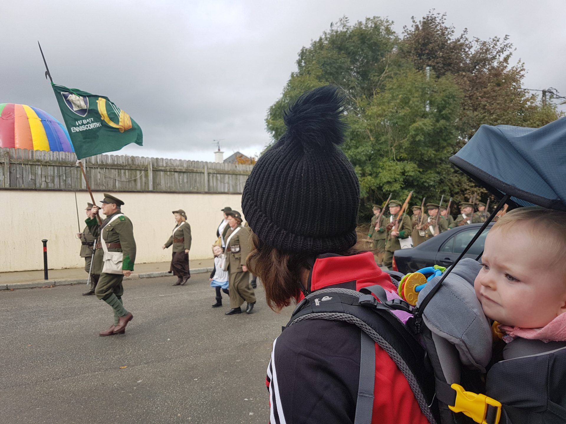 We could see in the distance a large crowd and the road was closed off, we continued walking the trail and came up to the crowd. There was a marching band, and a parade full of people dressed up in 1798 army gear (We picked a good time to do this Wexford hike).