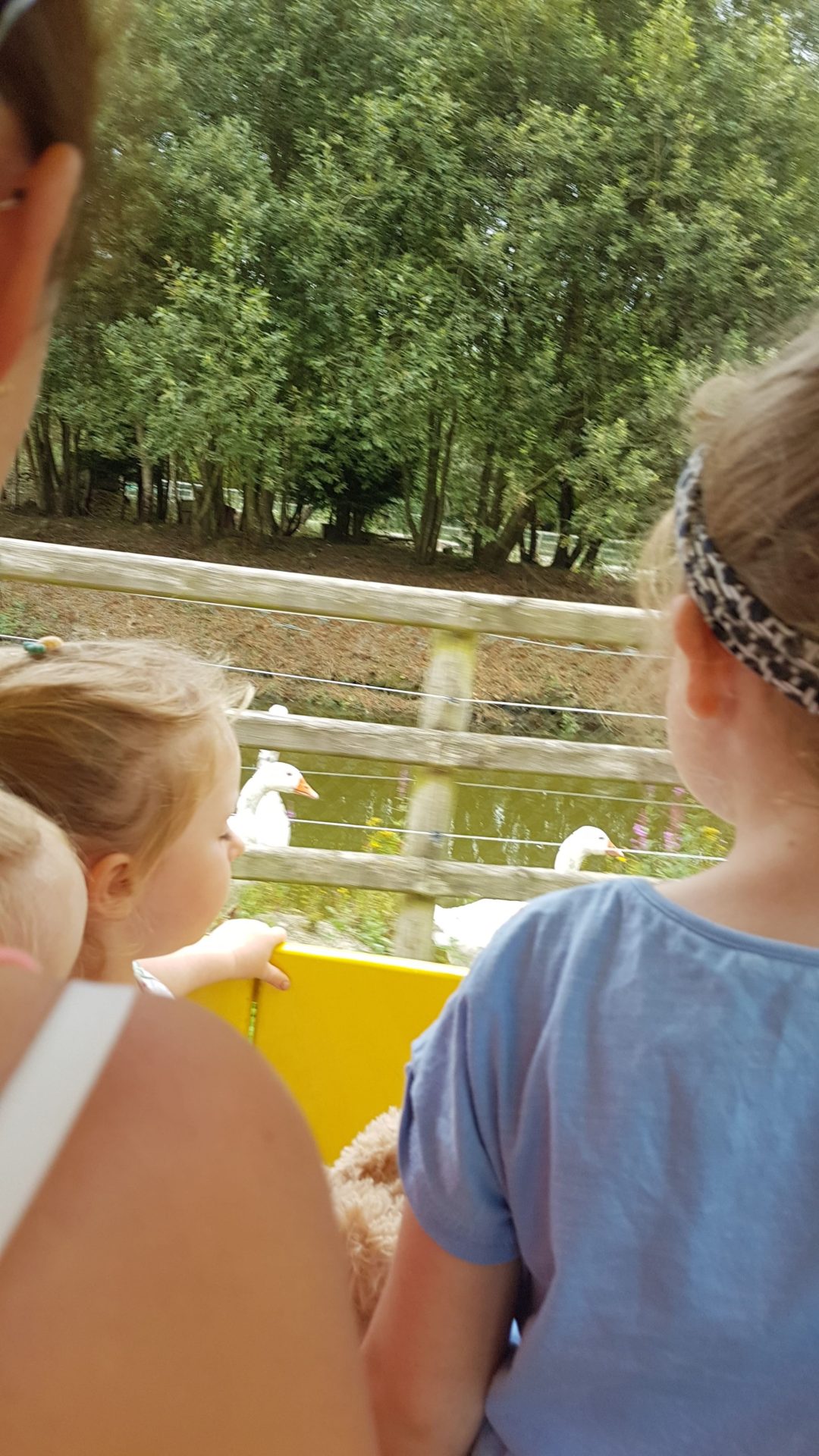 We stopped at the lake and stayed on the train while Goldilocks went to all the boys and girls giving them bread to feed the geese. Everyone started to feed the geese and they loved it. All the birds ran toward the train, which was very exciting for the boys and girls and the Mammys and Daddys 😁. As the train started to drive off, all the geese followed the train around the lake. It was very exciting and everyone loved it.