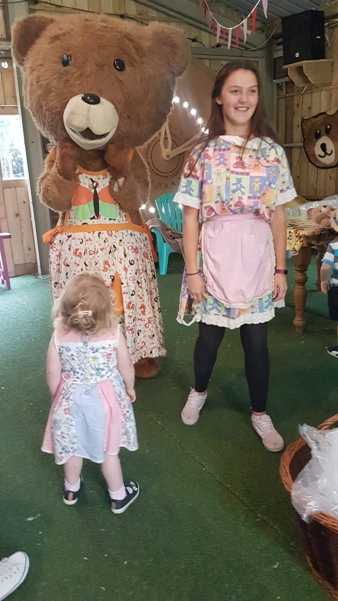 Each child got a small teddy bear and stuffing. They all sat around at small tables to stuff their bears. Goldilocks and the three bears were dancing around the factory and Ourlittlehiker was amazed by all their energy and amazing dance moves. She followed them around staring up in their faces.