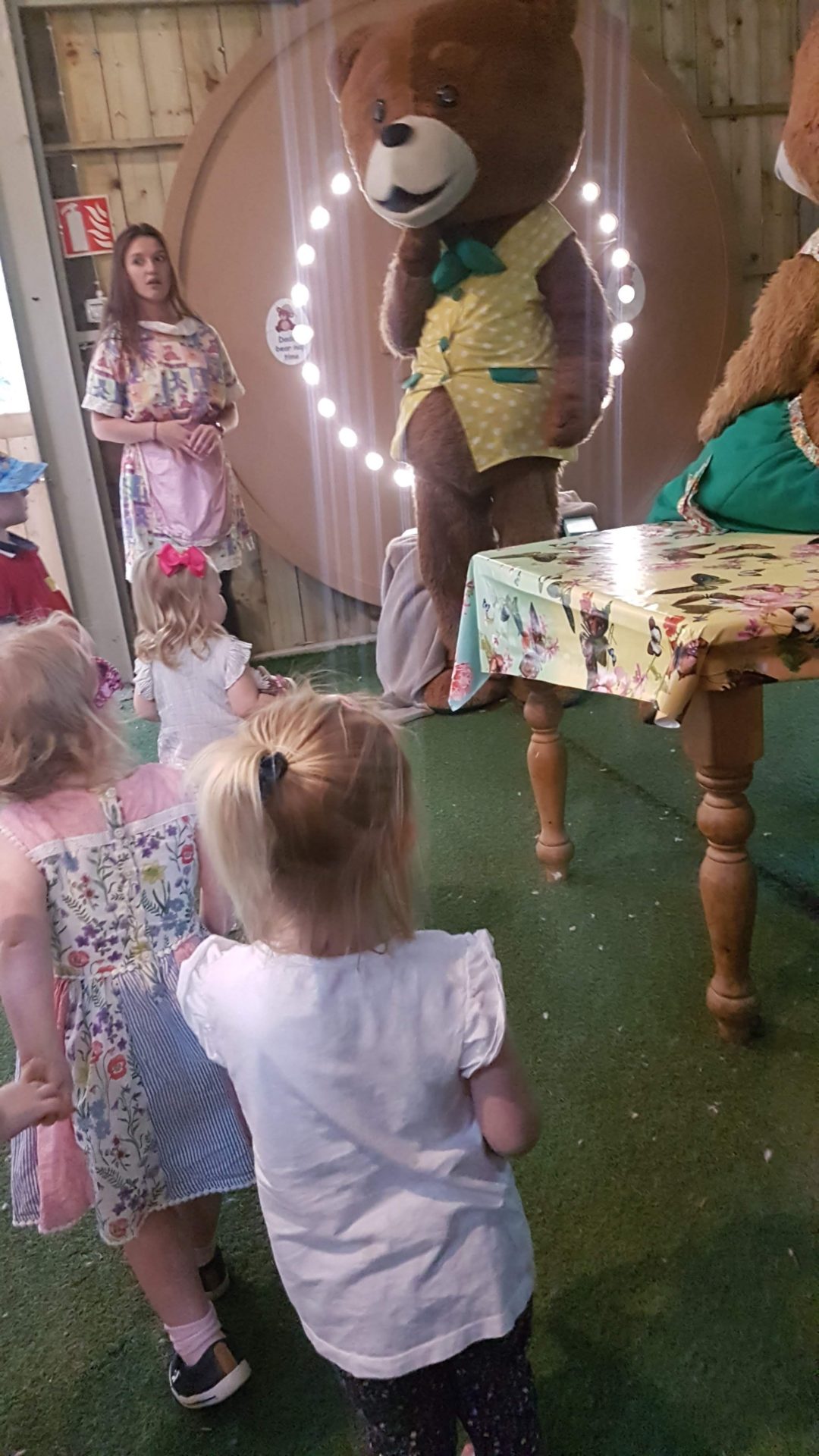 The teddybear factory was a timber building hidden away in the forest. It was lit up with fairy lights and gave off an amazing atmosphere of adventure and playfulness. When we went into the workshop, we found daddy bear sleeping. Goldilocks and Mamma bear asked everyone to sing a song to help wake Daddy bear up, so when we sang the ”bear greeting” song he jumped up from underneeth his blanket.