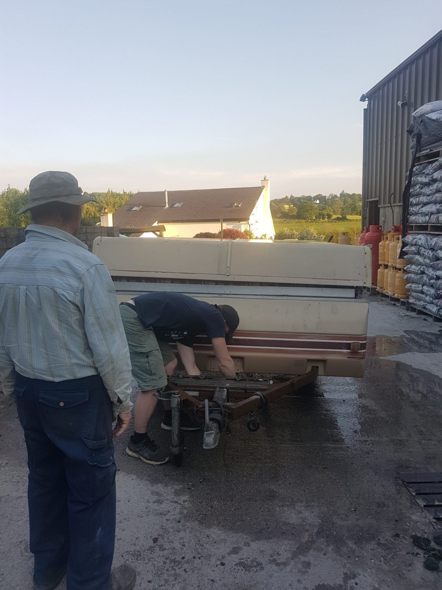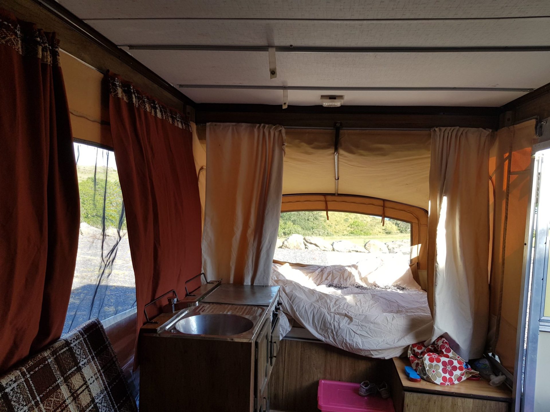 We did a temporary fix with some metal bars and bolts to stop the bed from pivoting off the frame of the camper. As we are in the middle of a heat wave in Ireland, we didn’t even attempt to fix the damaged stitching on the tarps. We did buy new tires for €130 and a cylinder of gas for €30. So we essentially have a camper ready to use for the grand total of €160 and a few bruised knuckles.