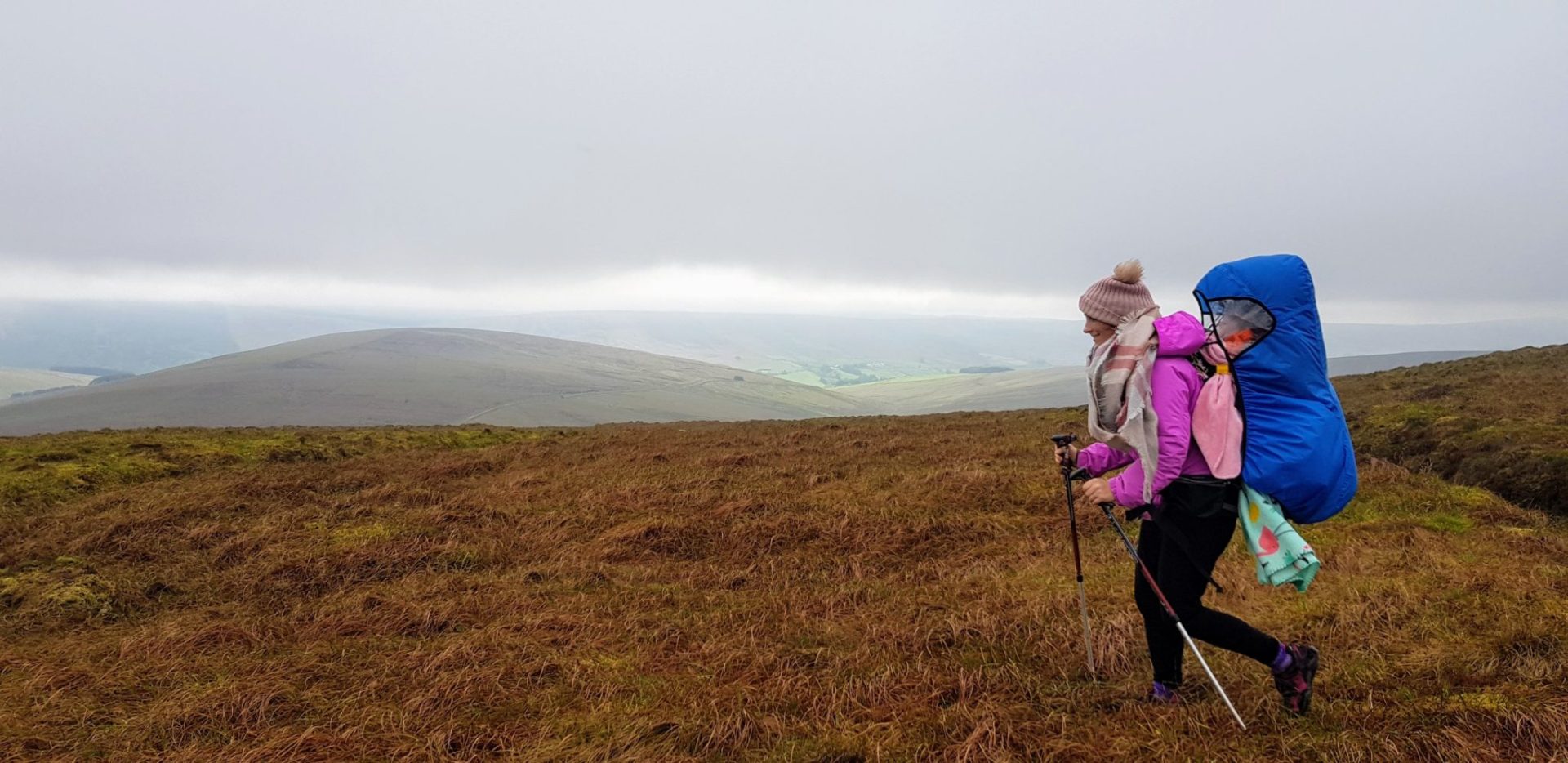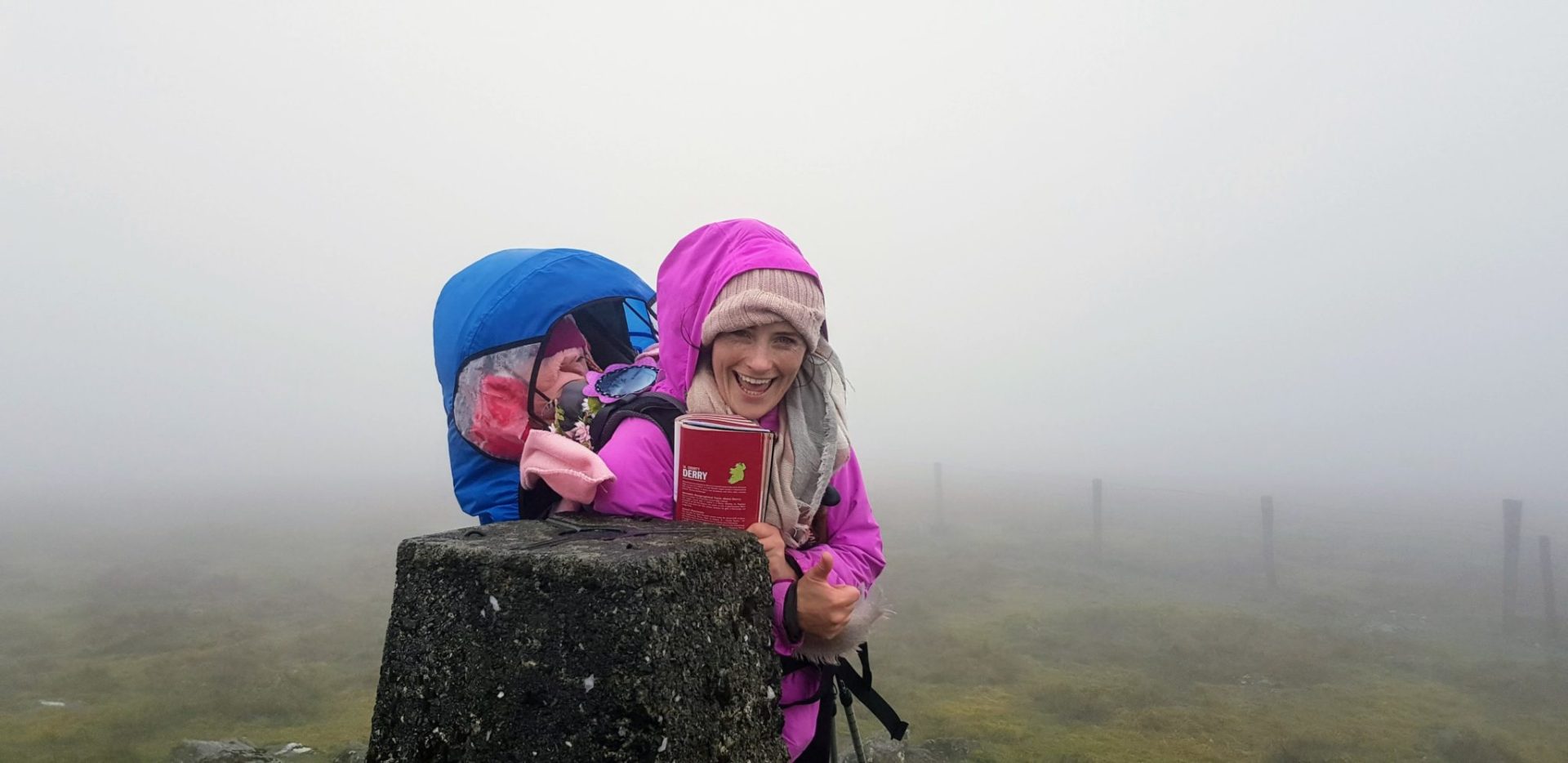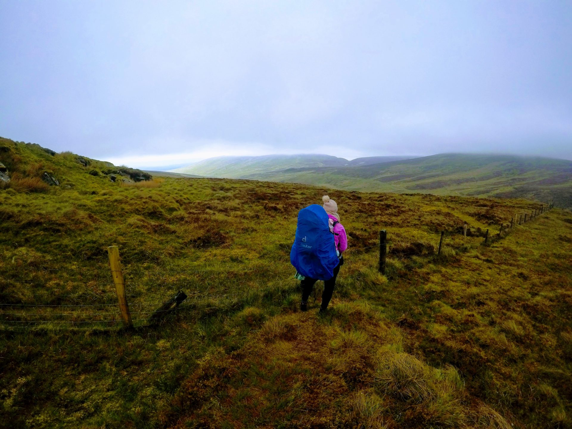 When looking out at the mountain we could not see any further than 200m. We decided to put on our hiking gear and wrap Ourlittlehiker up really well in her backpack and to go for a small walk to test the conditions. The day was not cold but mainly foggy, we consulted our maps and guidebook and knew that we were going to be following a fence the whole way to the summit of Sawel. So we decided to start hiking and if the weather starts to deteriorate we would return back to the car.