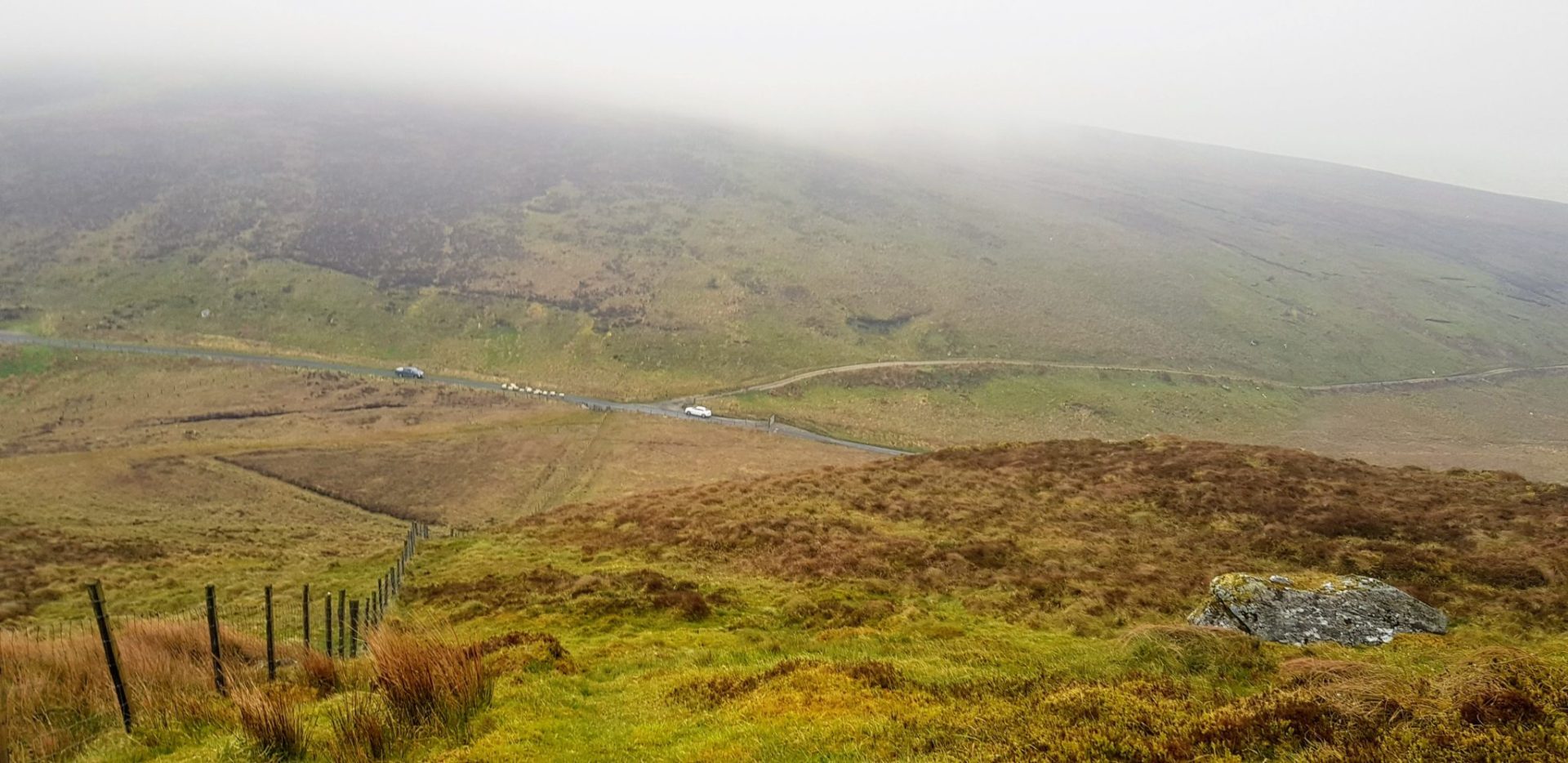 Just as we were climbing the final section of Sawel mountain the fog got very heavy but we were sticking close to the fence for guidance. It is safe to say we would never have attempted this hike without the fence to guide us to the summit. Just as we reached the highest point of the fence it veers left, we knew that Sawel high point was in front of us but the fog was too dense to see it. We took out our Viewranger app on our phones and we could see exactly where we were and where the county high point was, so we walked in the right direction and found the Cairn in seconds.