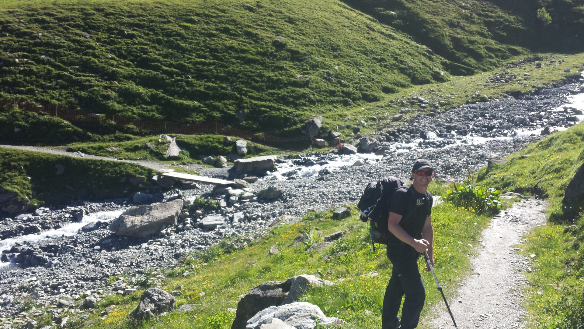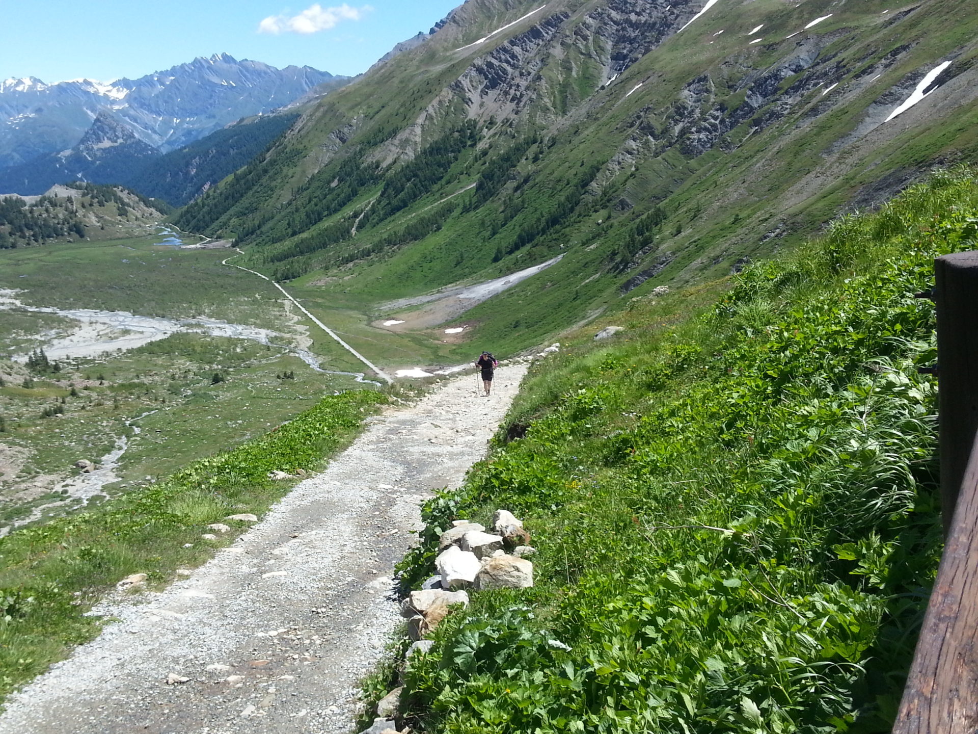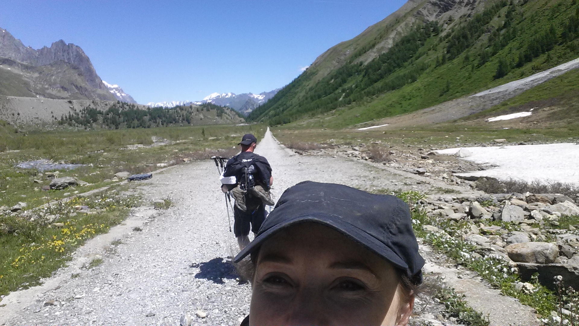 We started walking back down into the valley on the other side of Col de la Seigne, it wasn’t as steep of a descent as we were expecting. The first part of the descent we started to walk down through the snow, which was quite steep for about 100m and tricky to keep footing but also very fun.
