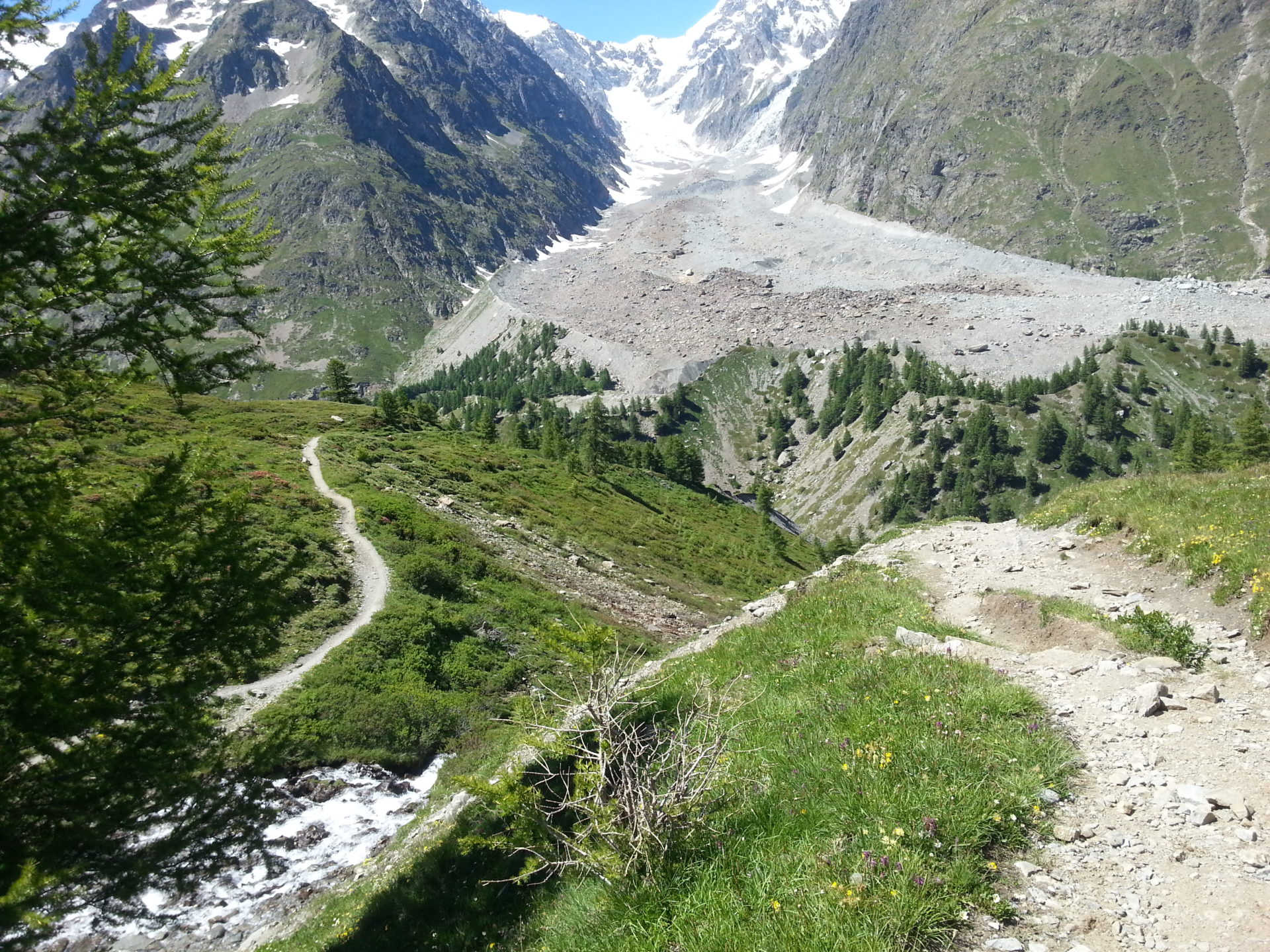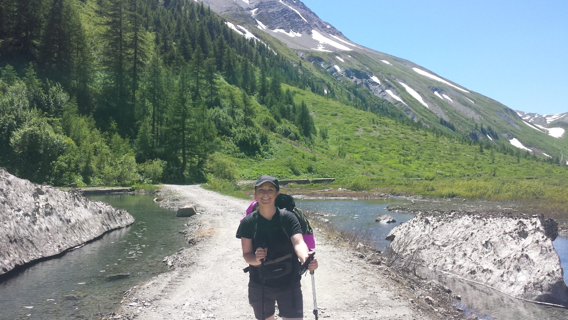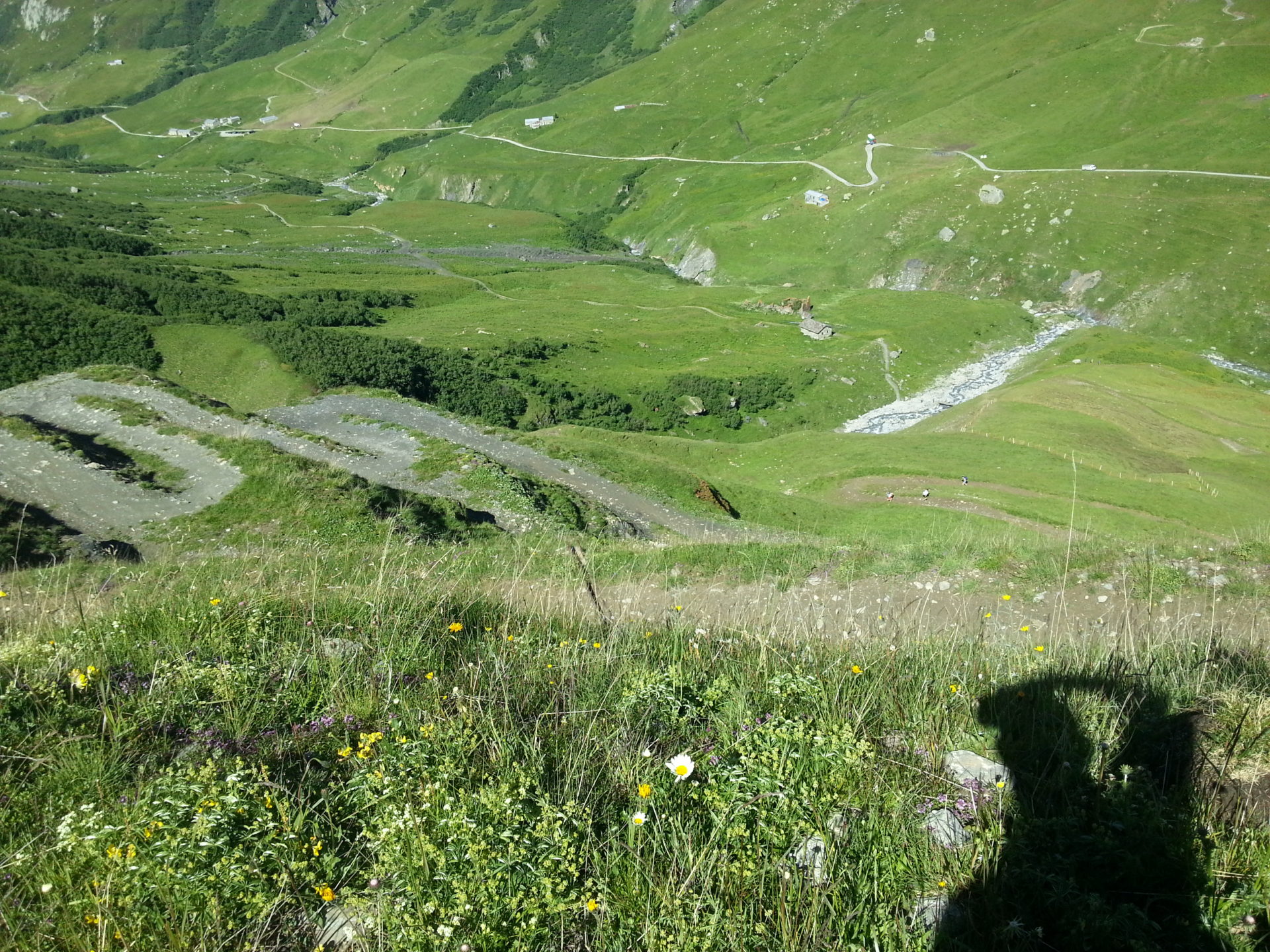 We started walking back down into the valley on the other side of Col de la Seigne, it wasn’t as steep of a descent as we were expecting. The first part of the descent we started to walk down through the snow, which was quite steep for about 100m and tricky to keep footing but also very fun.