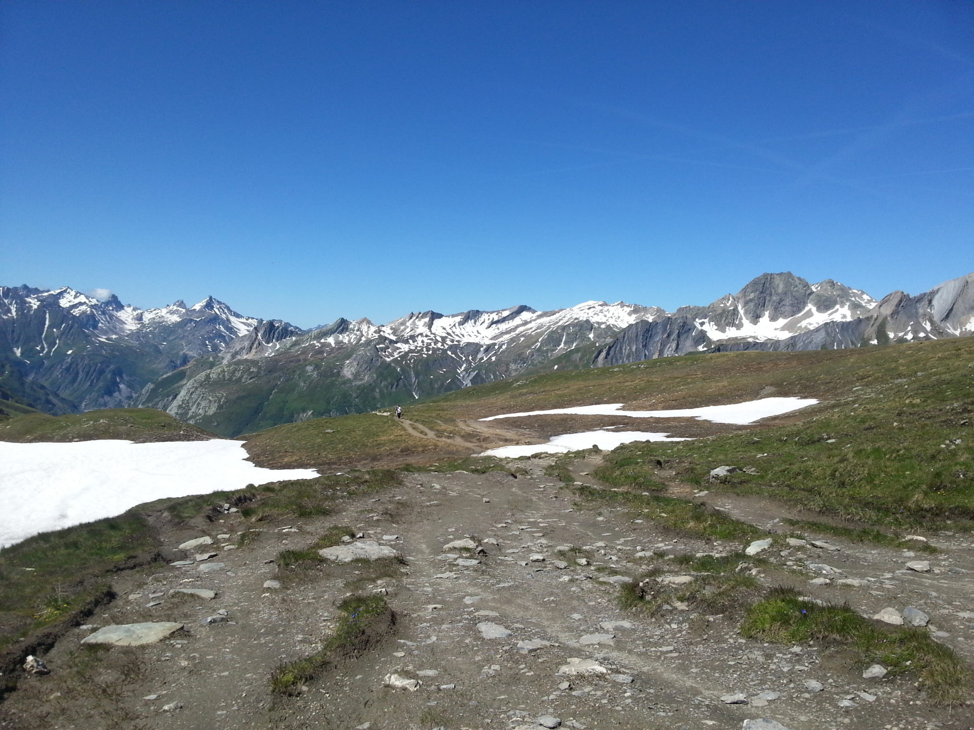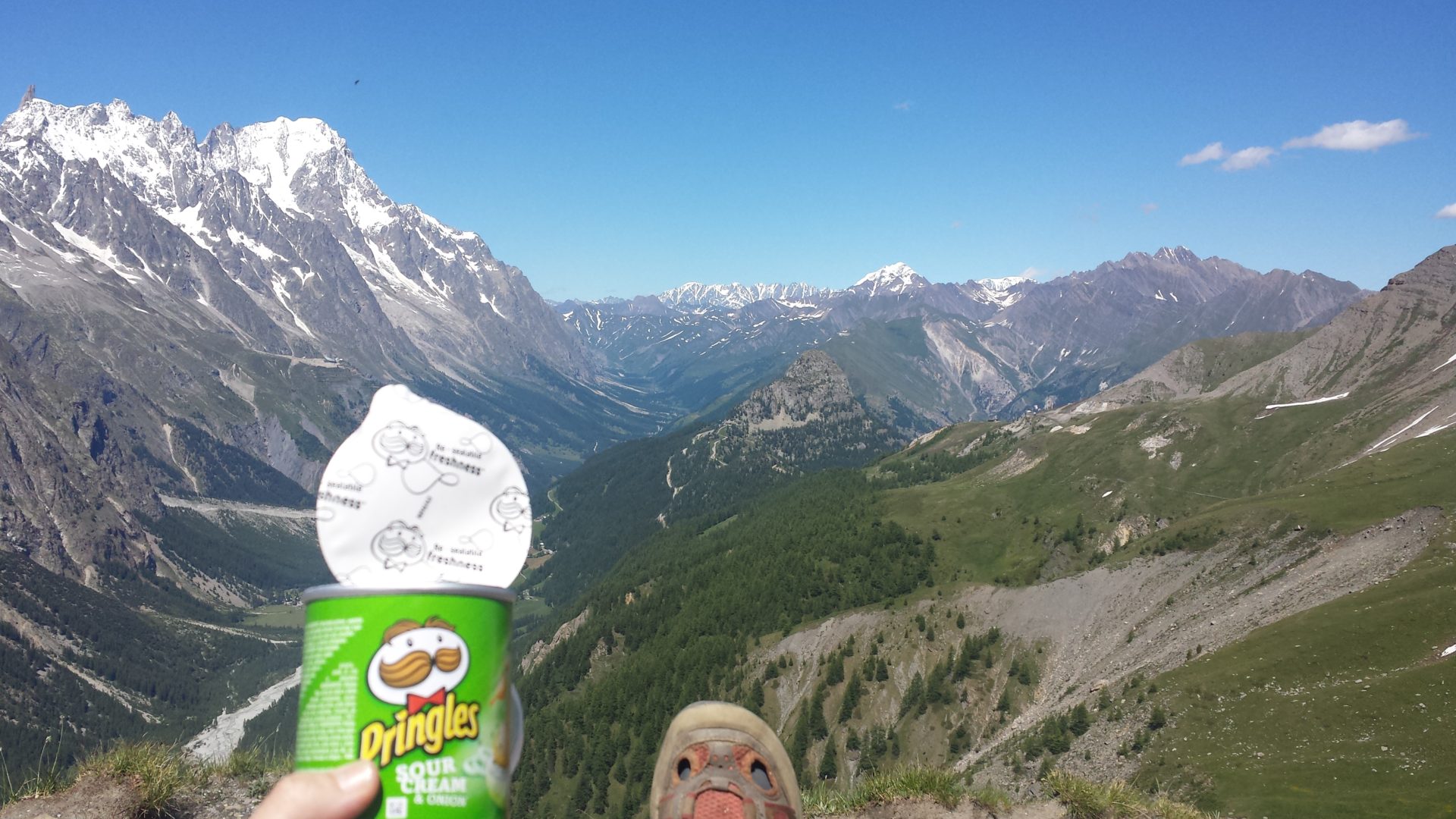 We decided to get a quick bite to eat from our supplies, as the view on top of Col de la Seigne was worth just stopping and taking it all in. We were really lucky with the weather, when we were at the Col, as we were able to sit there in our tee-shirts without getting cold.