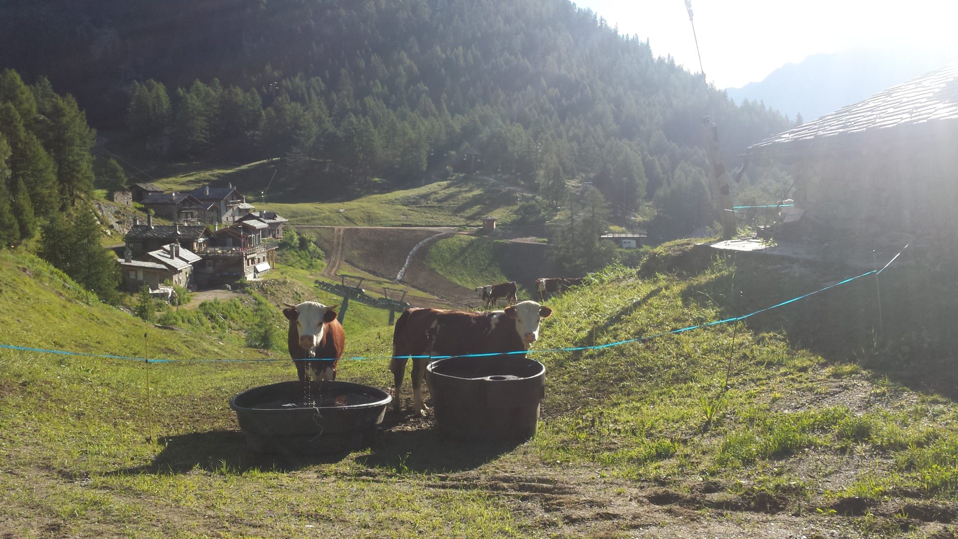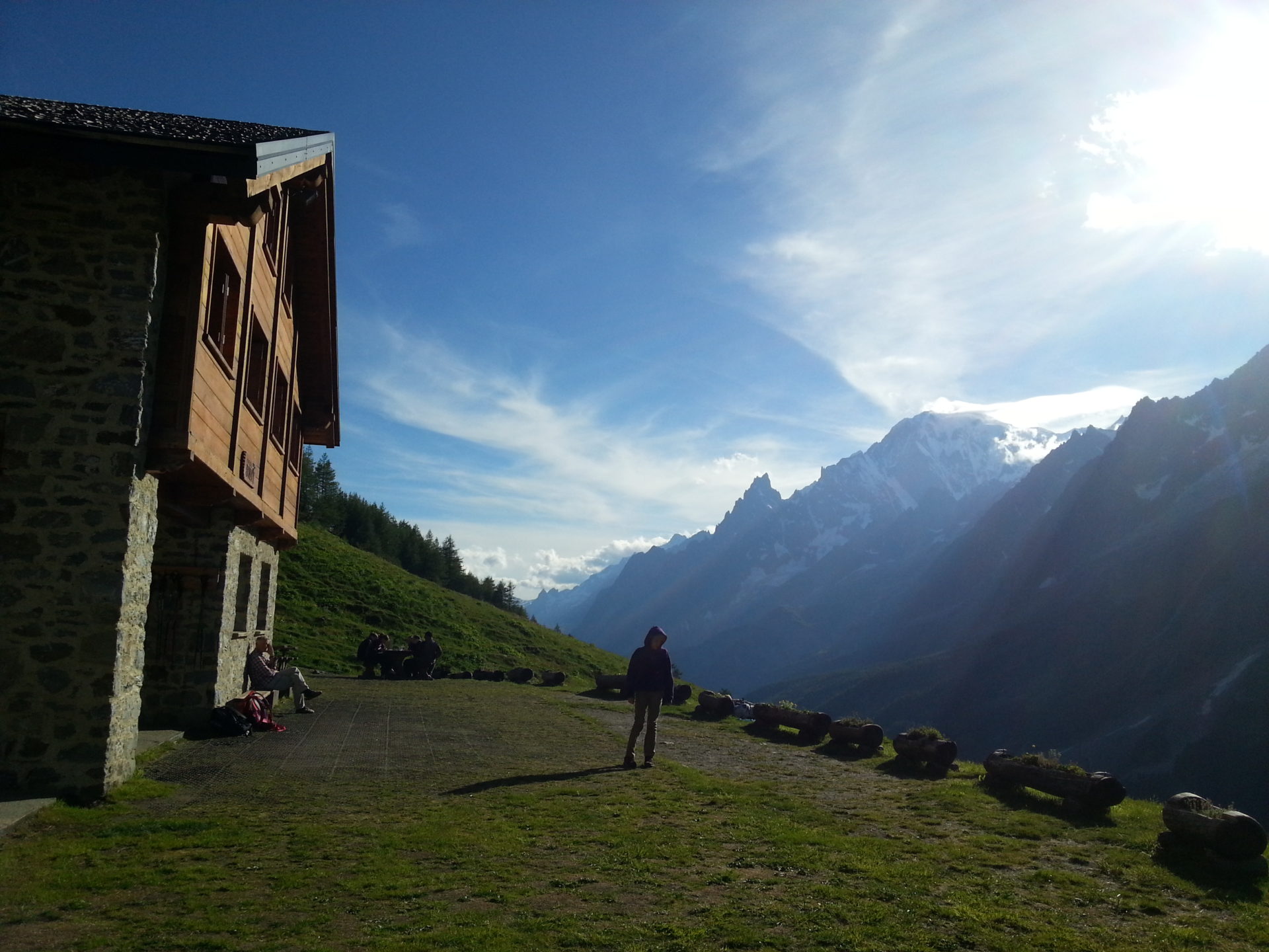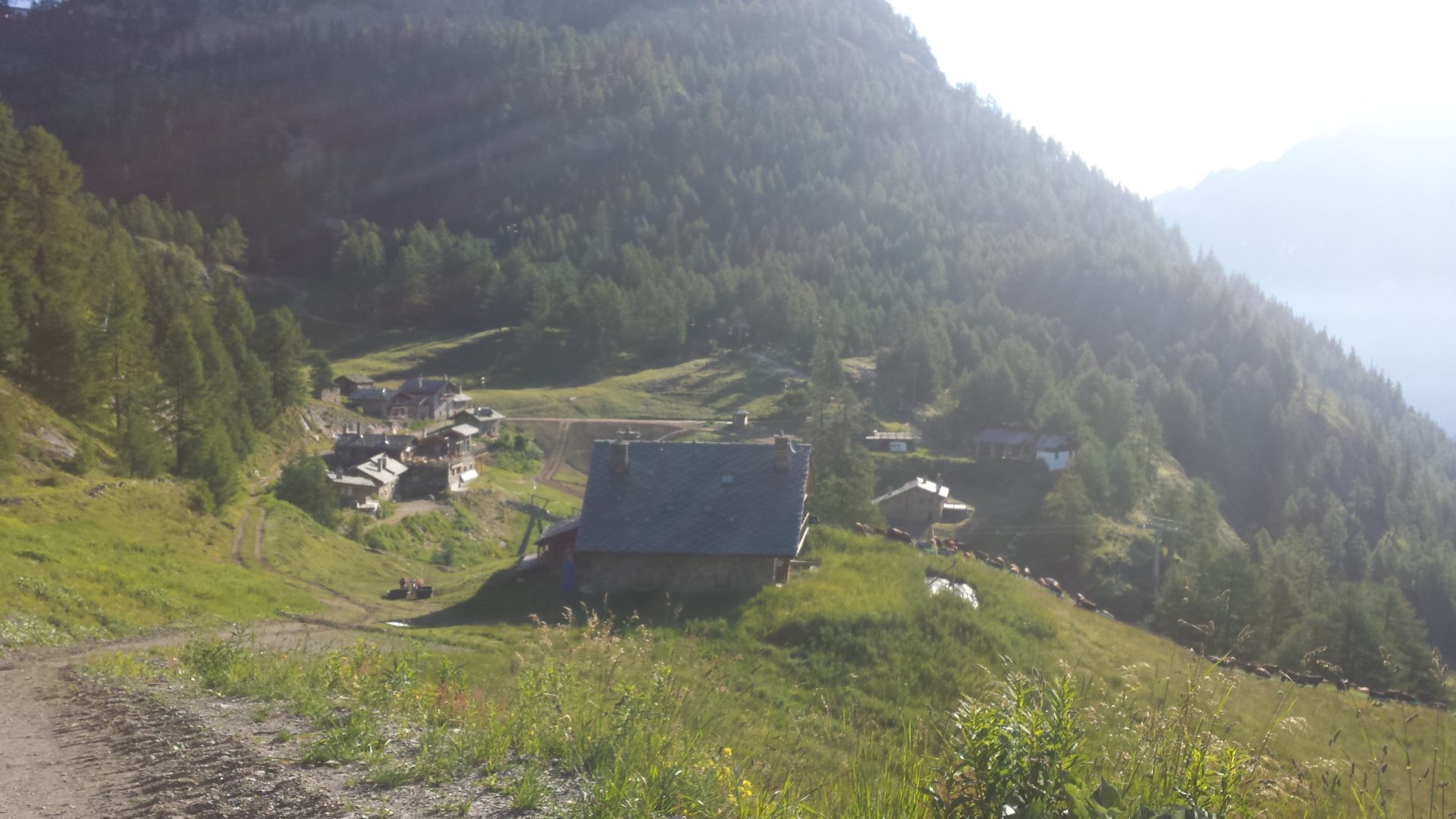 We left the hostel and cut down through a field to join the Tour of Mont Blanc trail which goes past a small hamlet filled with Rifugios and old buildings cut into the edge of the hill. We were walking downhill on a small lane cut through fields with cows.