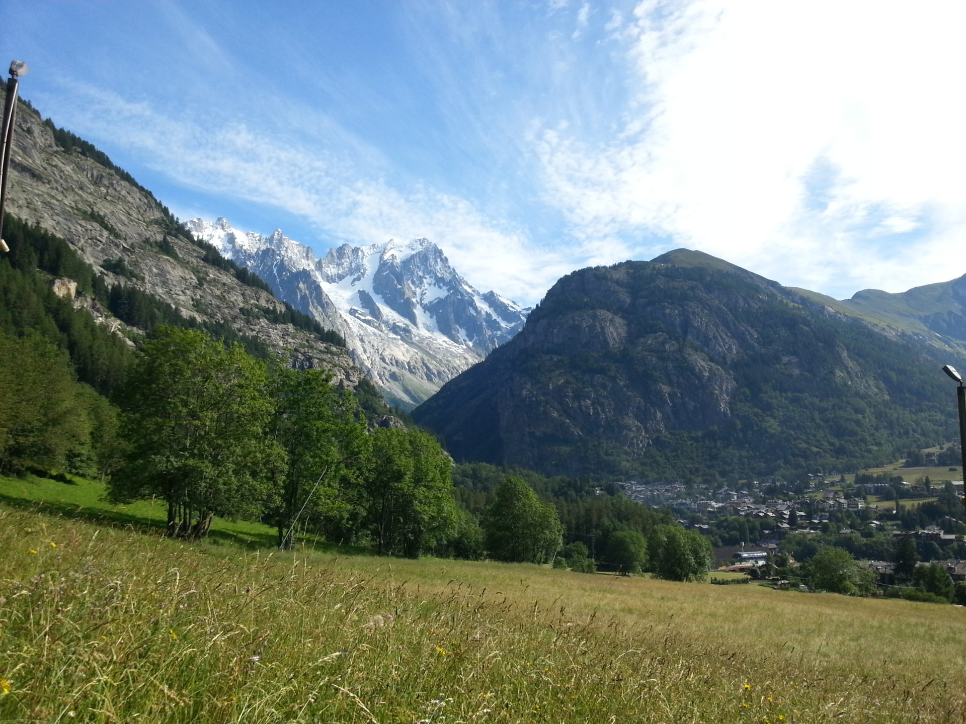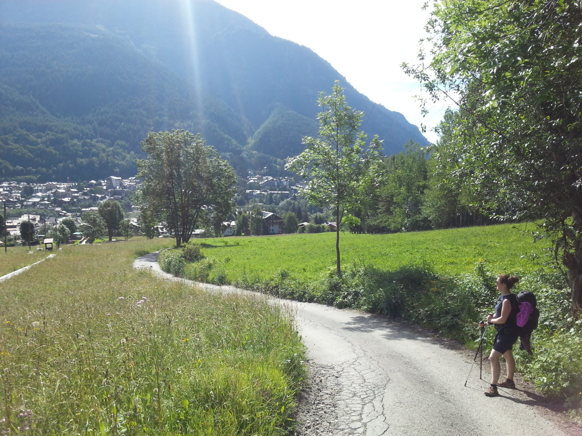 After the small hamlet, we walked into a wooded area and started to descend into the village of Courmayeur pretty quickly. The wooded area gave us a nice break away from the hot morning sun even though it was early, the heat was picking up. At the bottom of the wooded area, we walked into a meadow of wildflowers that lead to a small road which brought us into Courmayeur.
