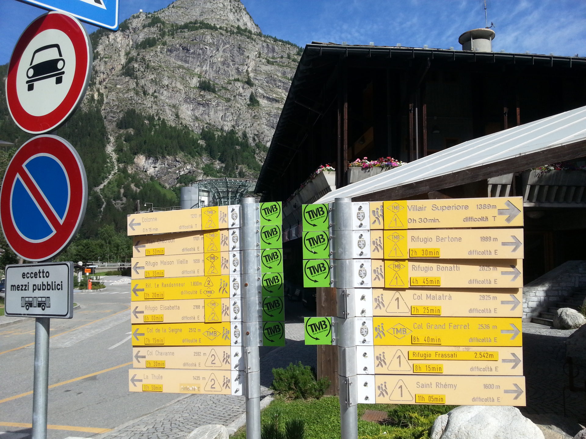 The small road meandered through old sections of Courmayeur for 30-40 minutes before we actually reached the main street. We eventually reached a large roundabout in the middle of the town and were greeted with a massive amount of TMB signs, at least we knew what was ahead of us.