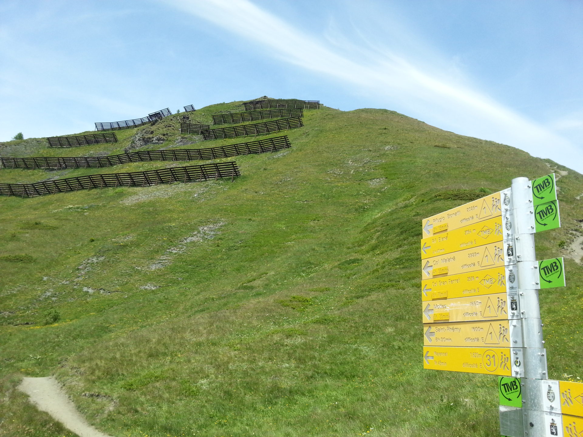 This section of the tour de mont blanc hike cuts through the side of a mountain and is very enjoyable. Rifugio Alpine G Bertone is at a height of 2000m and our desired rifugio for the night’s stay was only at 2050m high, so not much climbing involved. The section of the trail isn’t flat, it does raise and drop considerably but nothing too strenuous. This section of the tour de mont blanc hike is filled with amazing views to your left-hand side and lovely green field meadows and streams that you will be crossing continually.