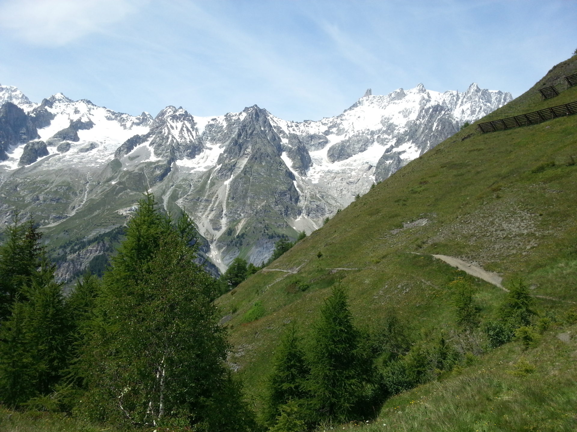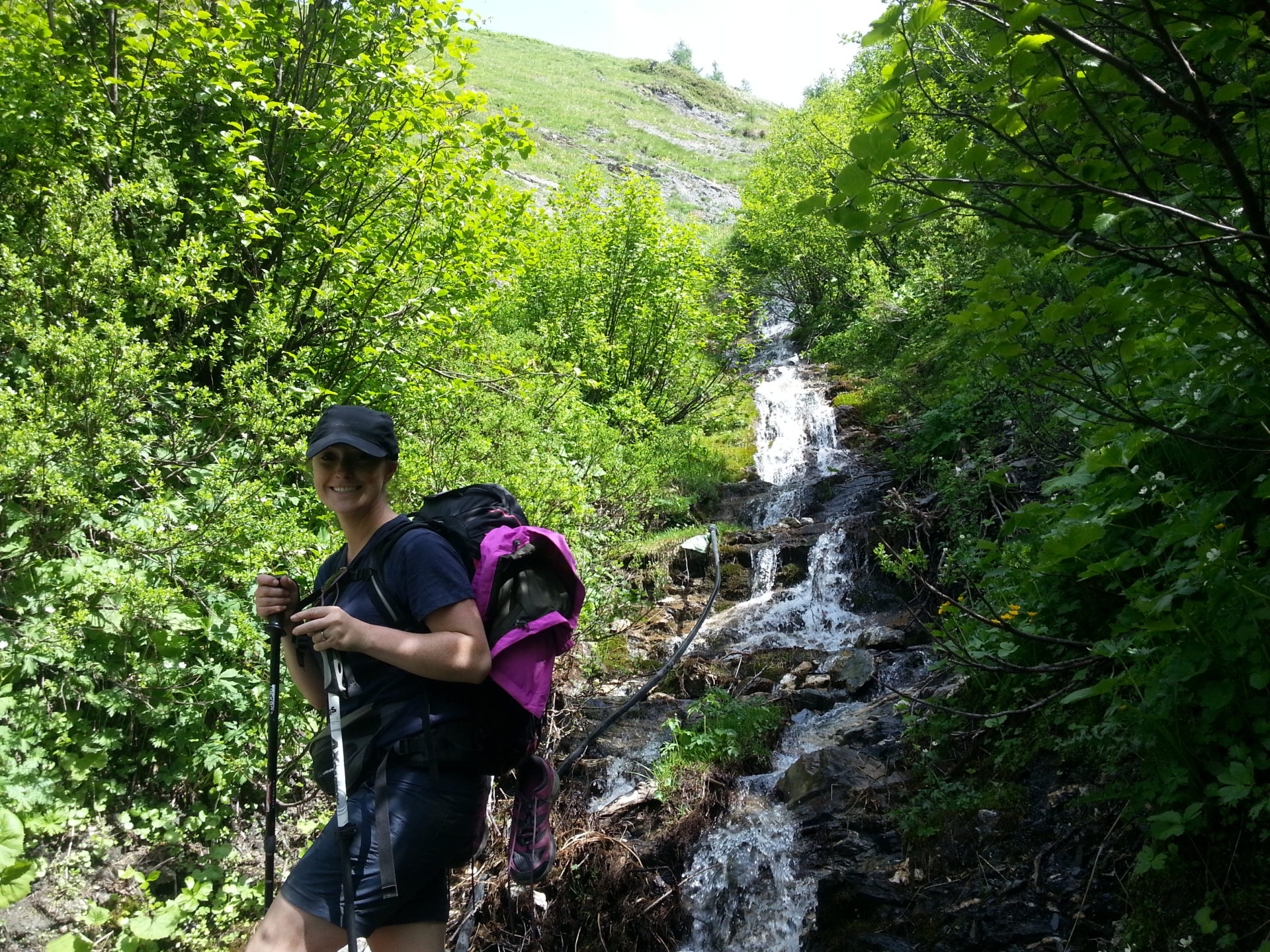 We relaxed in Courmayeur and done a small bit of sightseeing but we hit the trail again after about 45 minutes and 2 lots of ice cream (I think we are going to put weight on throughout this hike). The TMB trail out of Courmayeur leads up a steep road passing fields and eventually meeting a Tee junction that crosses a bridge with an impressive man-made waterfall behind it.